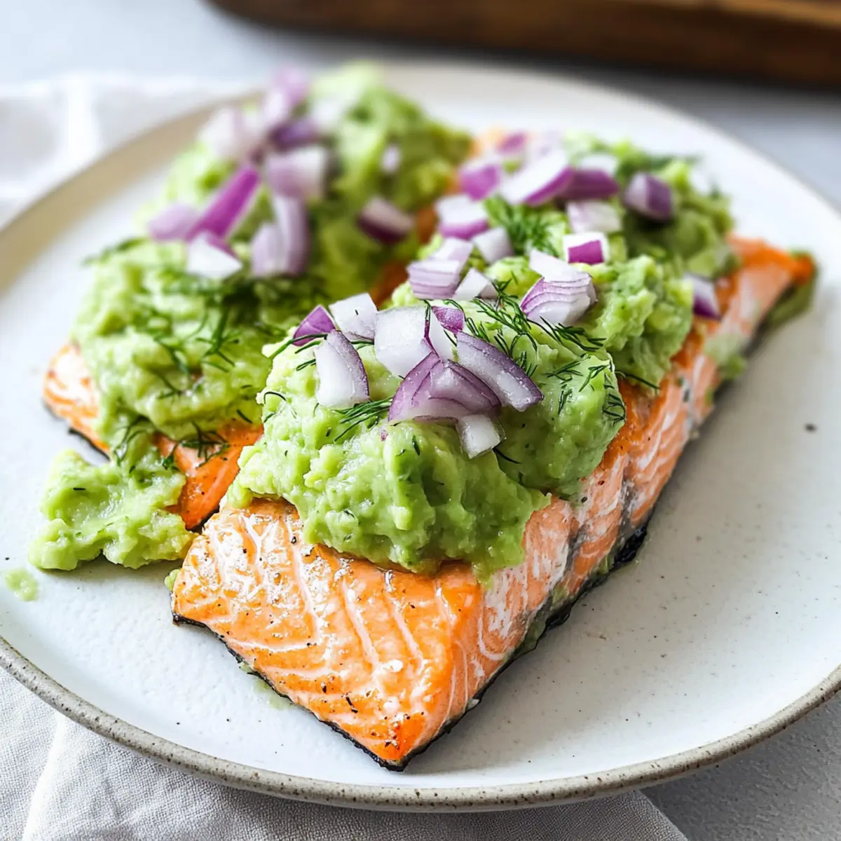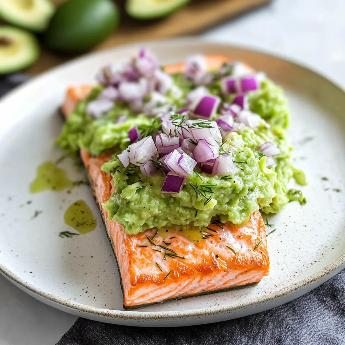 - Plate each salmon fillet and generously top with avocado mash. Garnish with chopped red onion and dill.