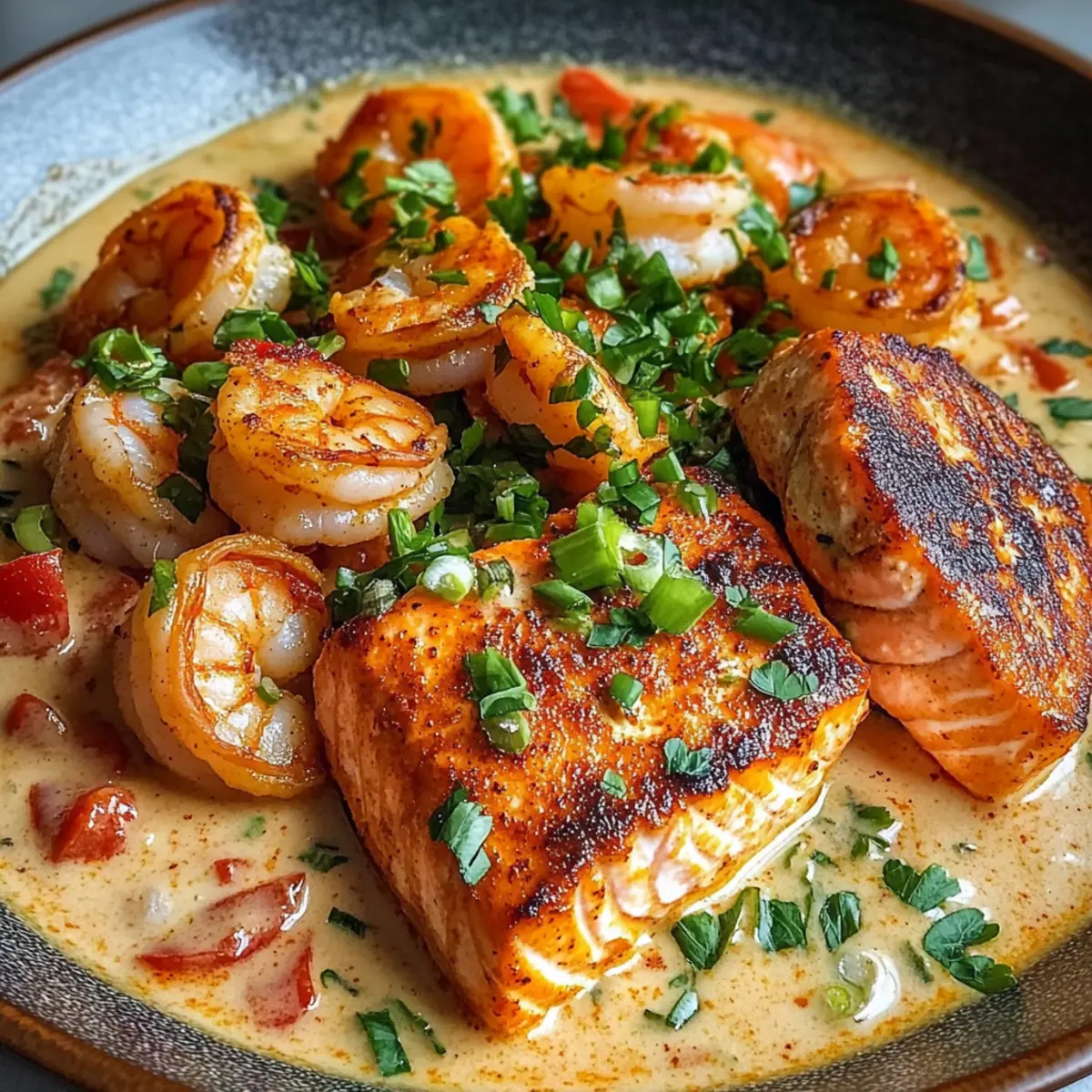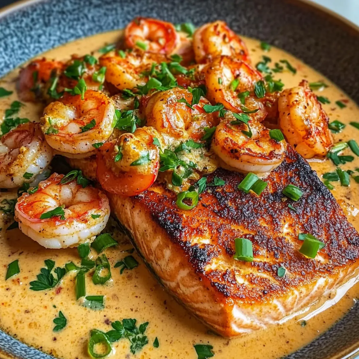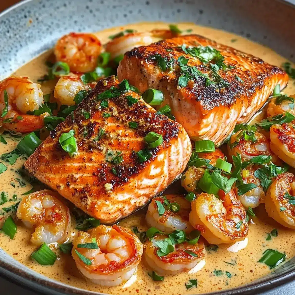 • Dive into the delicious details of Cajun Salmon & Shrimp with Creamy Cajun Sauce!