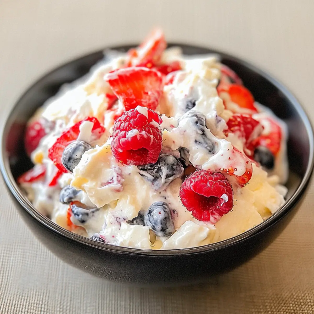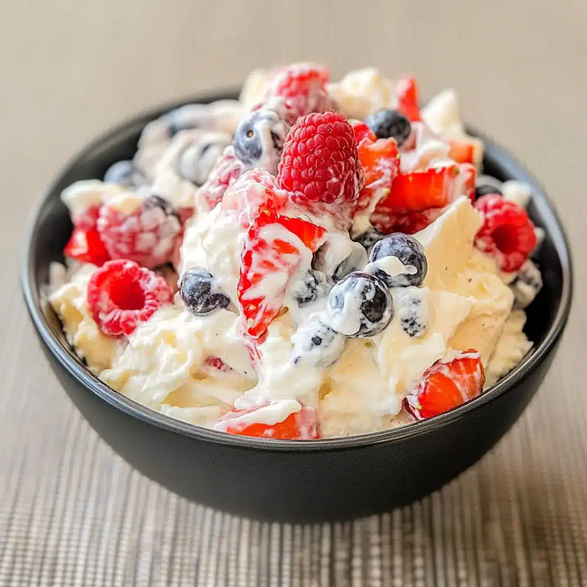 Now it’s time to mix in the vibrant fruits! Carefully add 1 cup of sliced strawberries, 1 cup of blueberries, and 1 cup of raspberries into the bowl. Gently fold the fruit into the creamy base, taking care not to break the berries. This step should take about 1-2 minutes, ensuring an even distribution of fruit throughout the Cheesecake Salad.