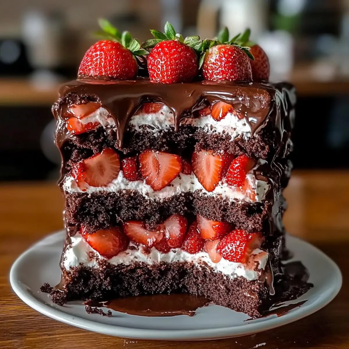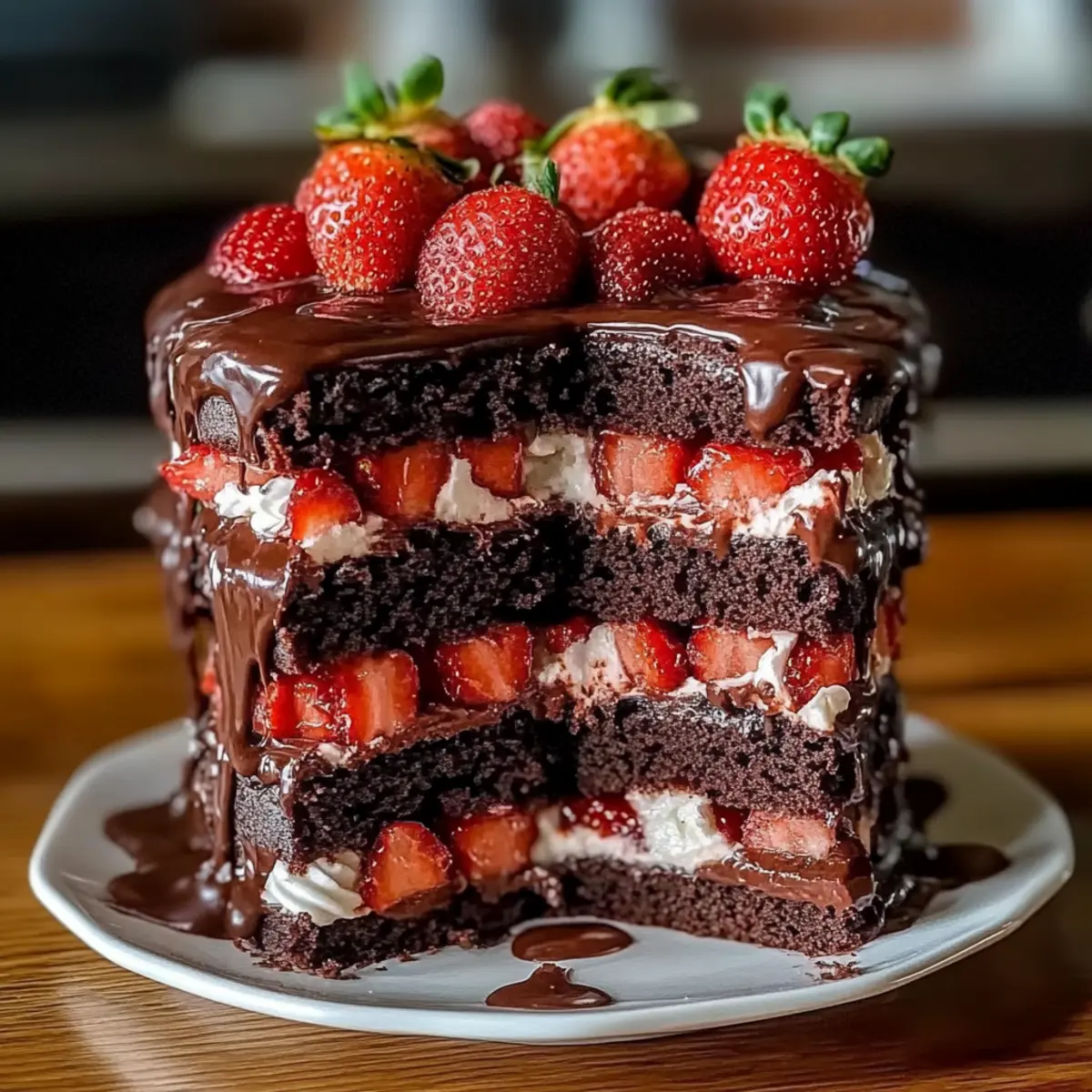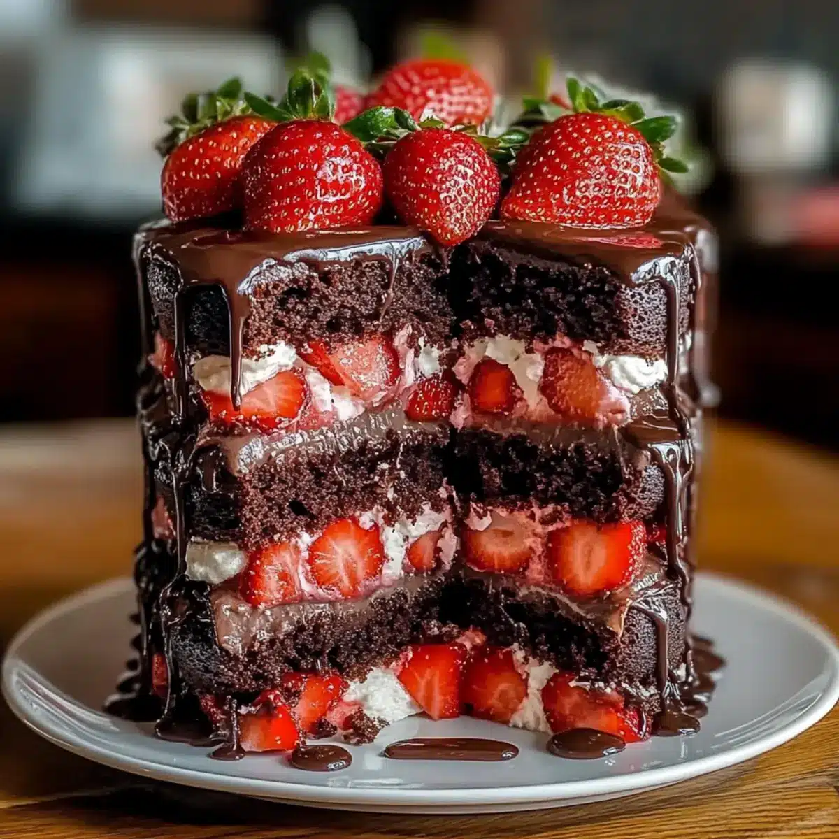 Decadent Layers: The rich chocolate layers paired with fresh strawberry filling create a stunning visual and taste experience that’s sure to impress guests.
