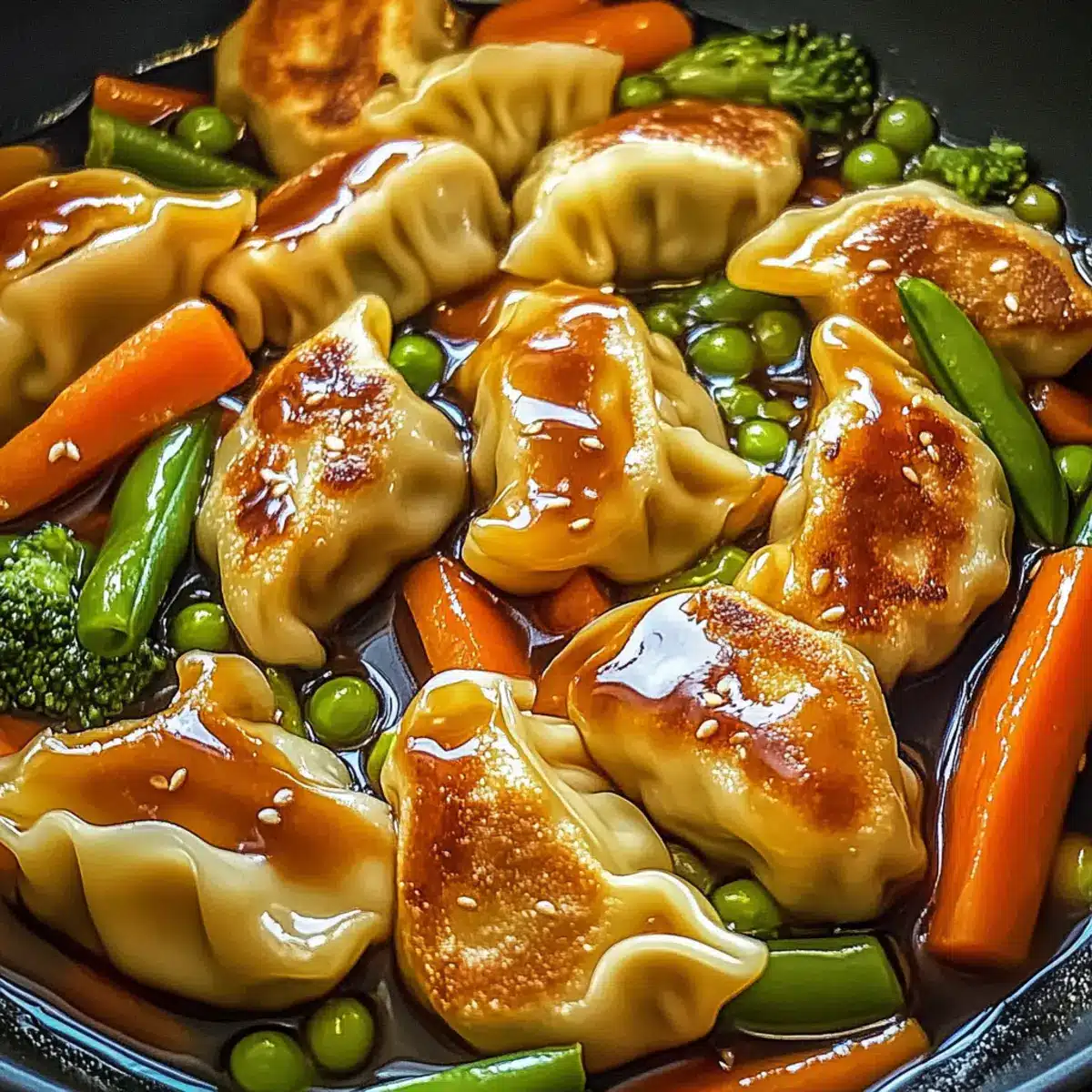- Pour the sauce mixture over the vegetables and potstickers in the skillet. Toss to coat everything evenly. Let simmer for 1 to 2 minutes, allowing the sauce to thicken. Garnish with sliced green onions and sesame seeds before serving.