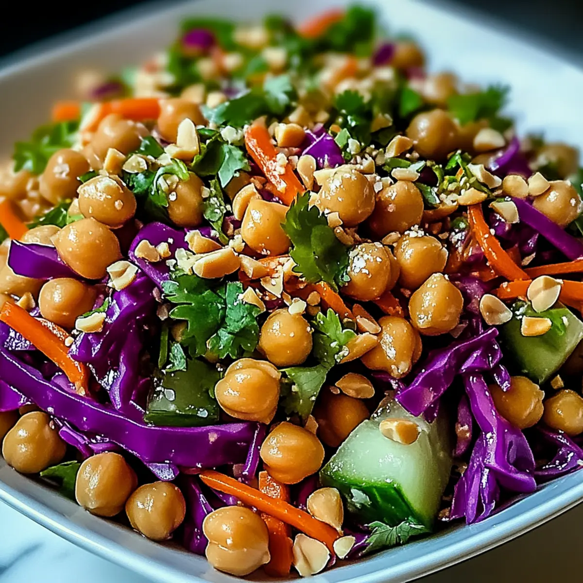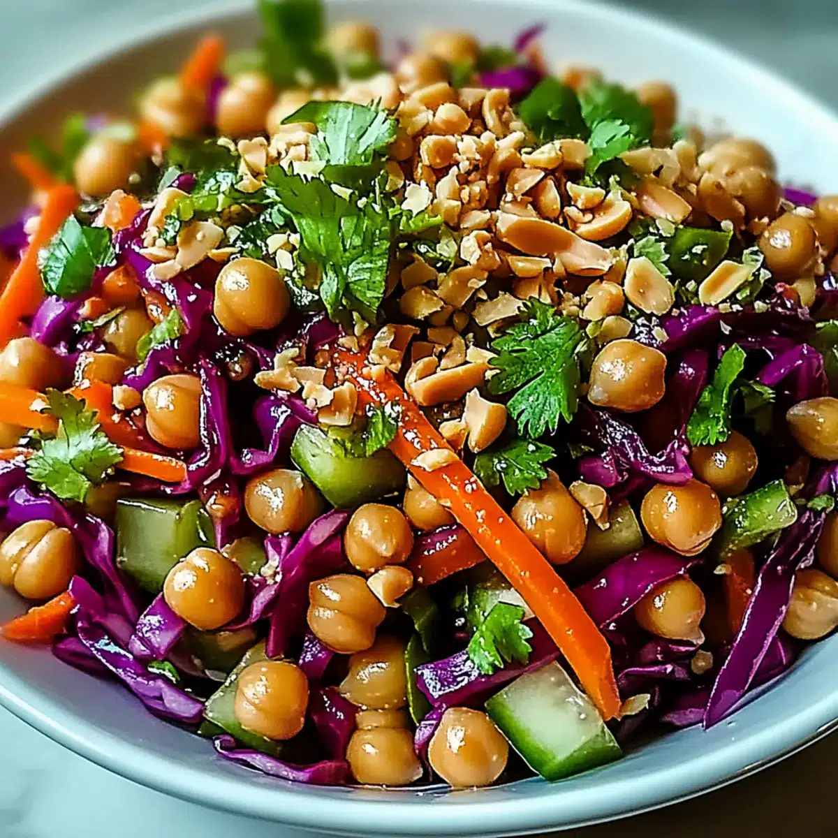 Before serving, sprinkle a handful of peanuts or cashews on top of your Crunchy Thai Chickpea Salad to add an extra layer of crunch and richness. This garnish not only enhances the appearance but also complements the creamy peanut dressing beautifully. Serve immediately, or store in the fridge for up to 3–4 days, adding the nuts just before serving to maintain their crunch.