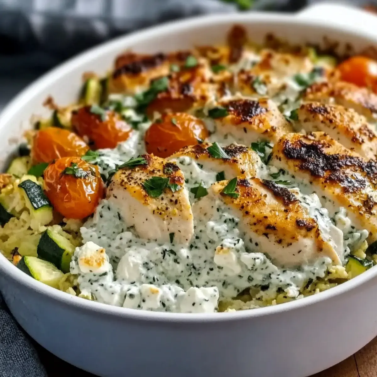 Choose fresh, firm vegetables that are free from dark spots or blemishes. Look for cherry tomatoes that are vibrant and fragrant and zucchinis that are smooth and glossy. This ensures not only the best flavor but also the ideal texture in your Dump-and-Bake Chicken Tzatziki Casserole.