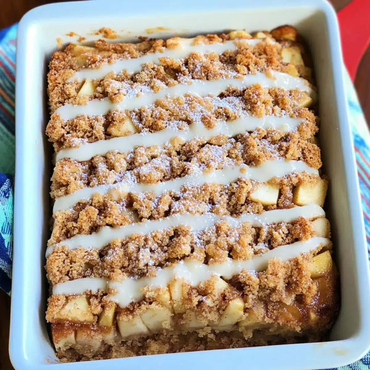 Place the pan in the preheated oven and bake for 35–45 minutes, or until the top is golden brown and a toothpick inserted in the center comes out clean. Keep an eye on it in the last few minutes to prevent overbaking. The lovely aroma of cinnamon and apples will fill your kitchen, promising a delightful treat ahead.