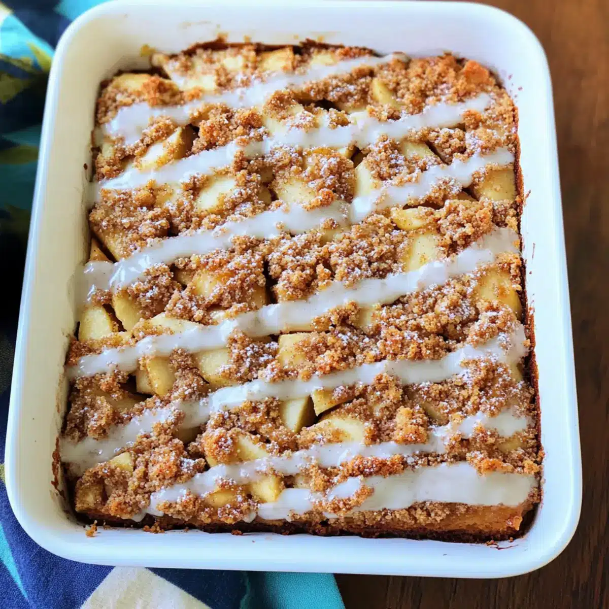 Once baked, remove the cake from the oven and let it cool in the pan for about 10 minutes. This brief cooling period makes it easier to glaze. In the meantime, prepare a simple glaze by mixing powdered sugar with a splash of milk until smooth. Drizzle this sweet glaze over the warm cake for the perfect finishing touch to your Easy Apple Cinnamon Coffee Cake.