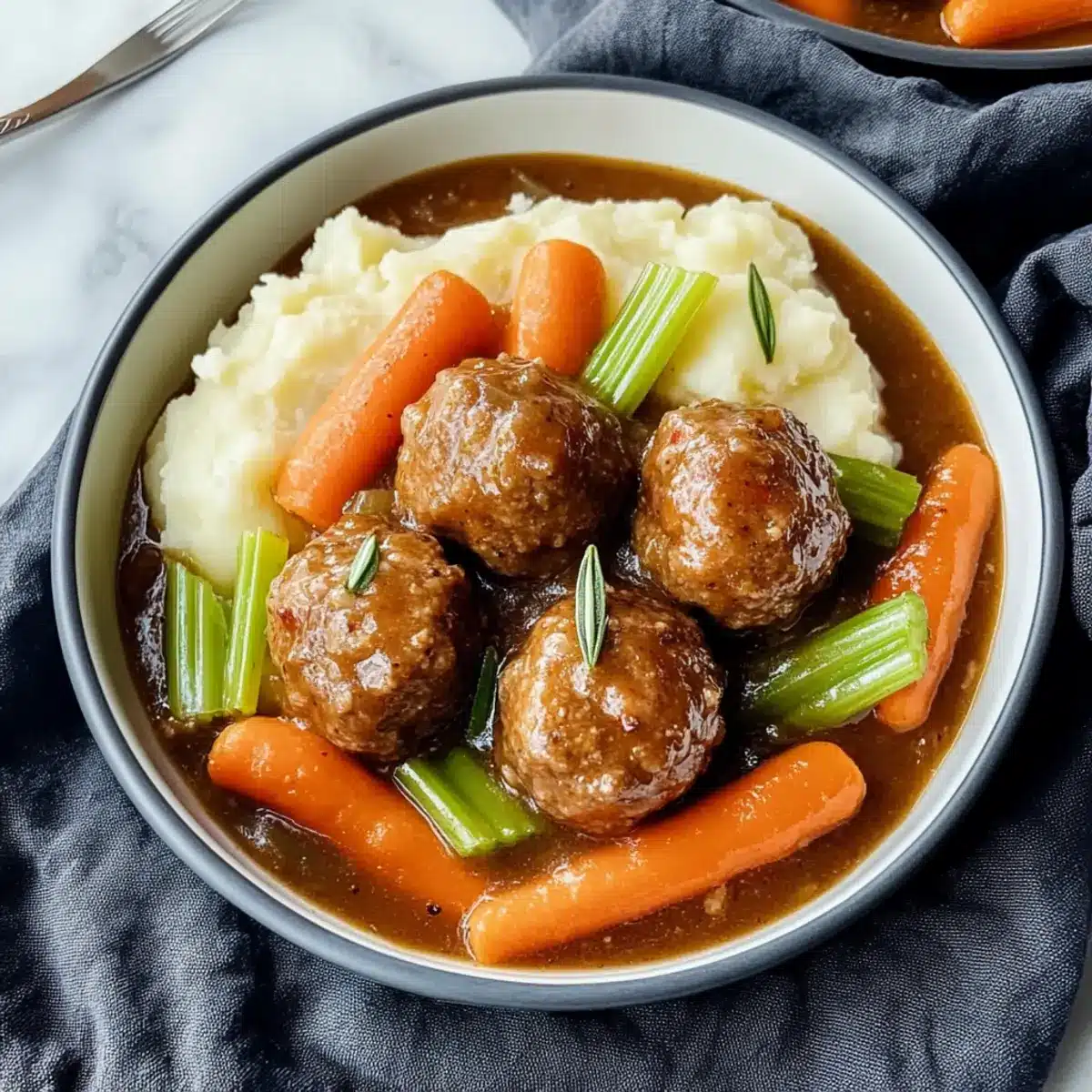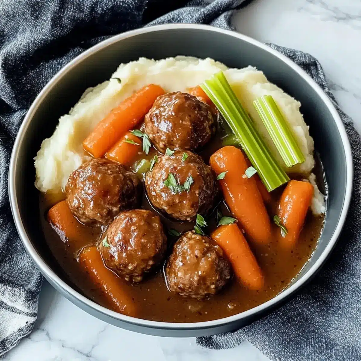 Savory Comfort: The rich brown gravy, tender meatballs, and fresh veggies create a dish that feels like a warm hug.
