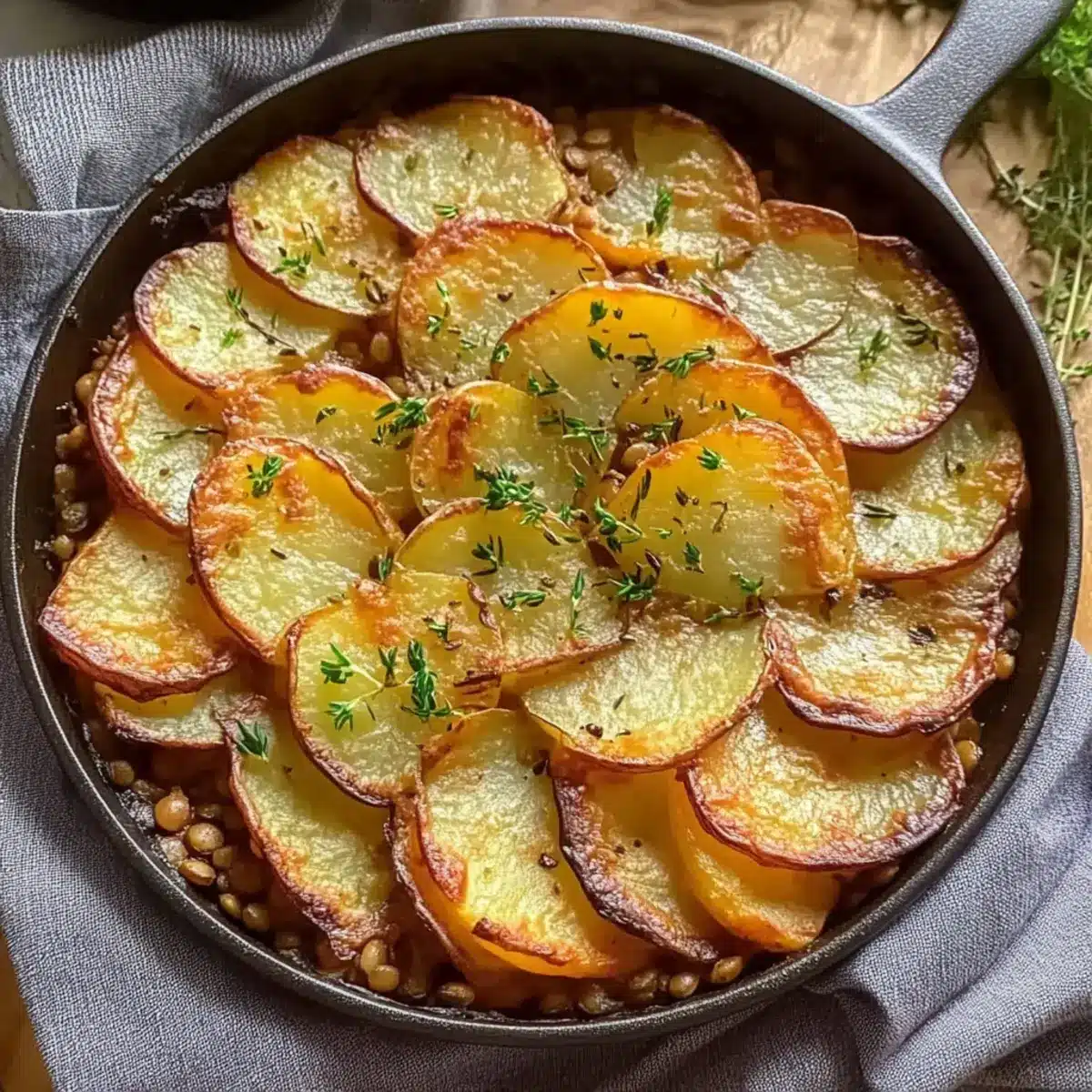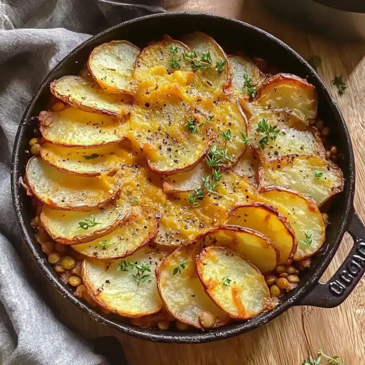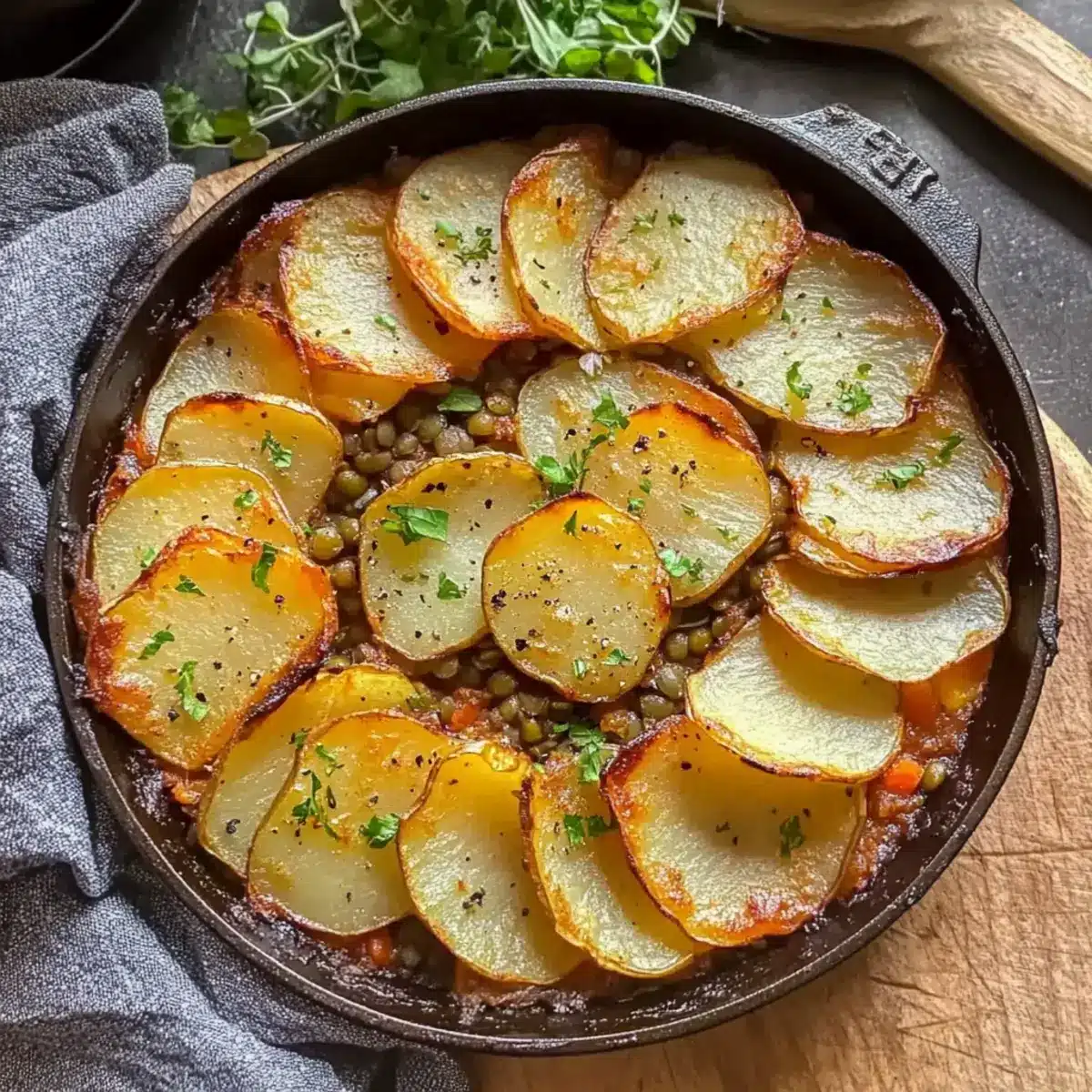 If your skillet isn’t oven-safe, carefully transfer the lentil sauce into a baking dish. Spread the lentil mixture evenly, then arrange the sliced potatoes in an overlapping pattern over the filling, creating a beautiful presentation that showcases the potatoes.