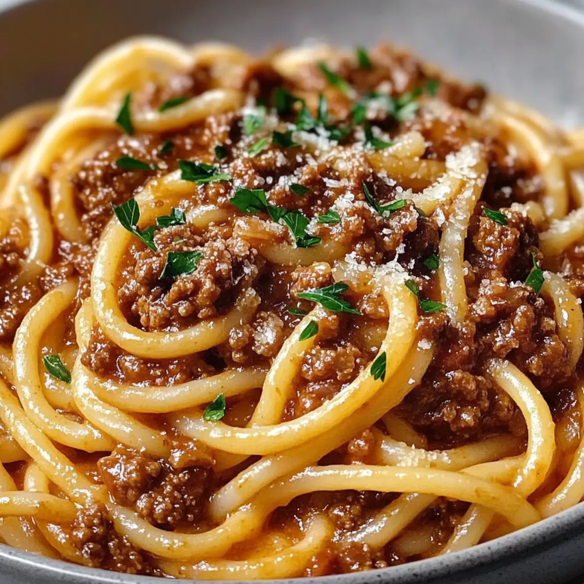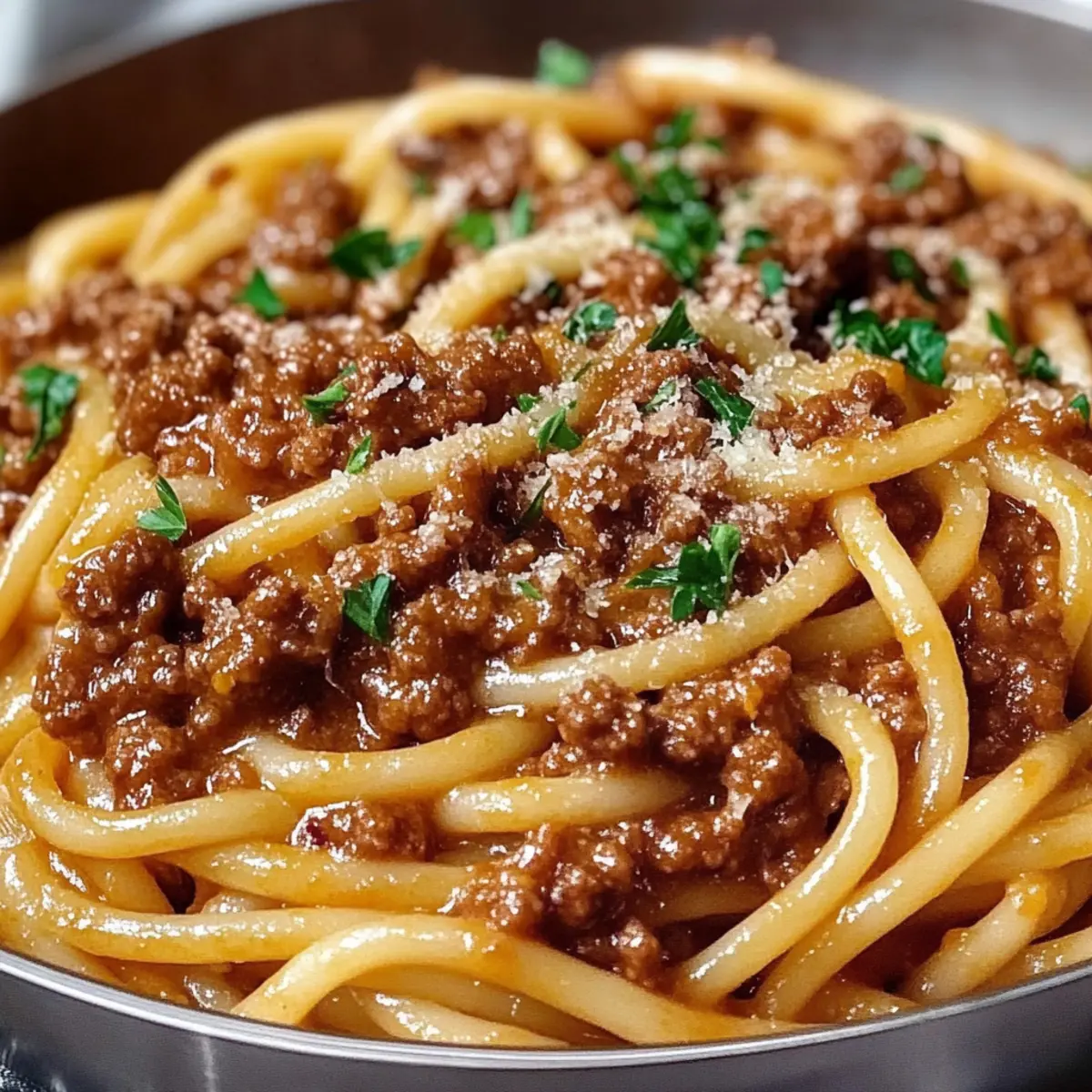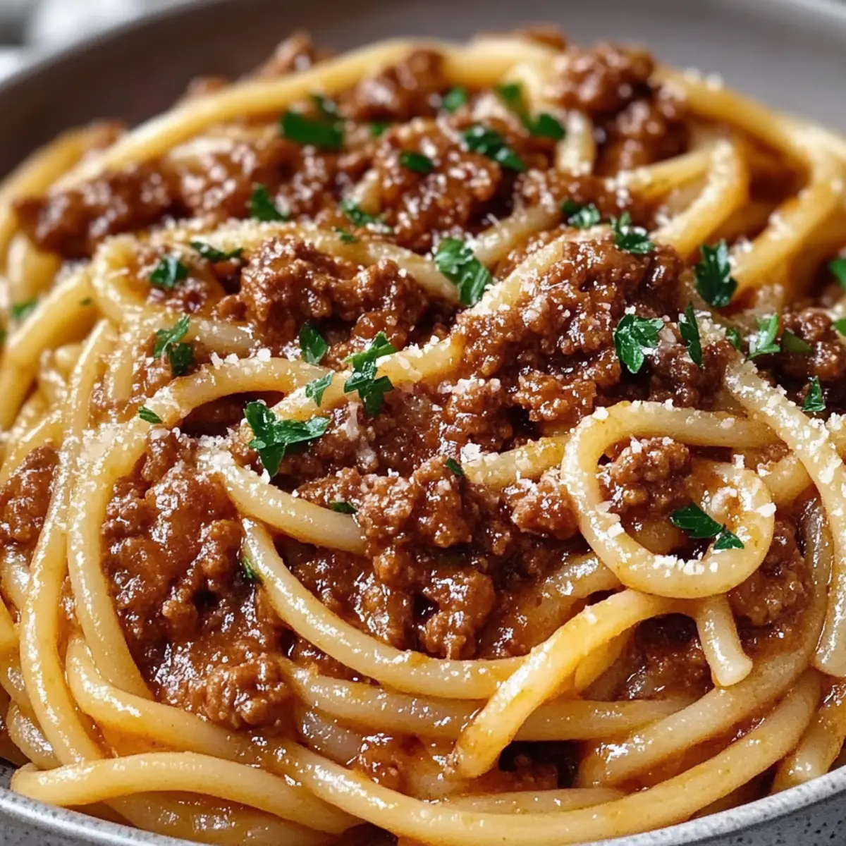 Serve your Hearty Bucatini Bolognese hot, garnished with a sprinkle of fresh parsley and freshly grated Parmesan cheese. This final touch adds color and a delightful flavor that enhances the richness of the sauce. Enjoy this comforting meal with loved ones for a truly satisfying experience.