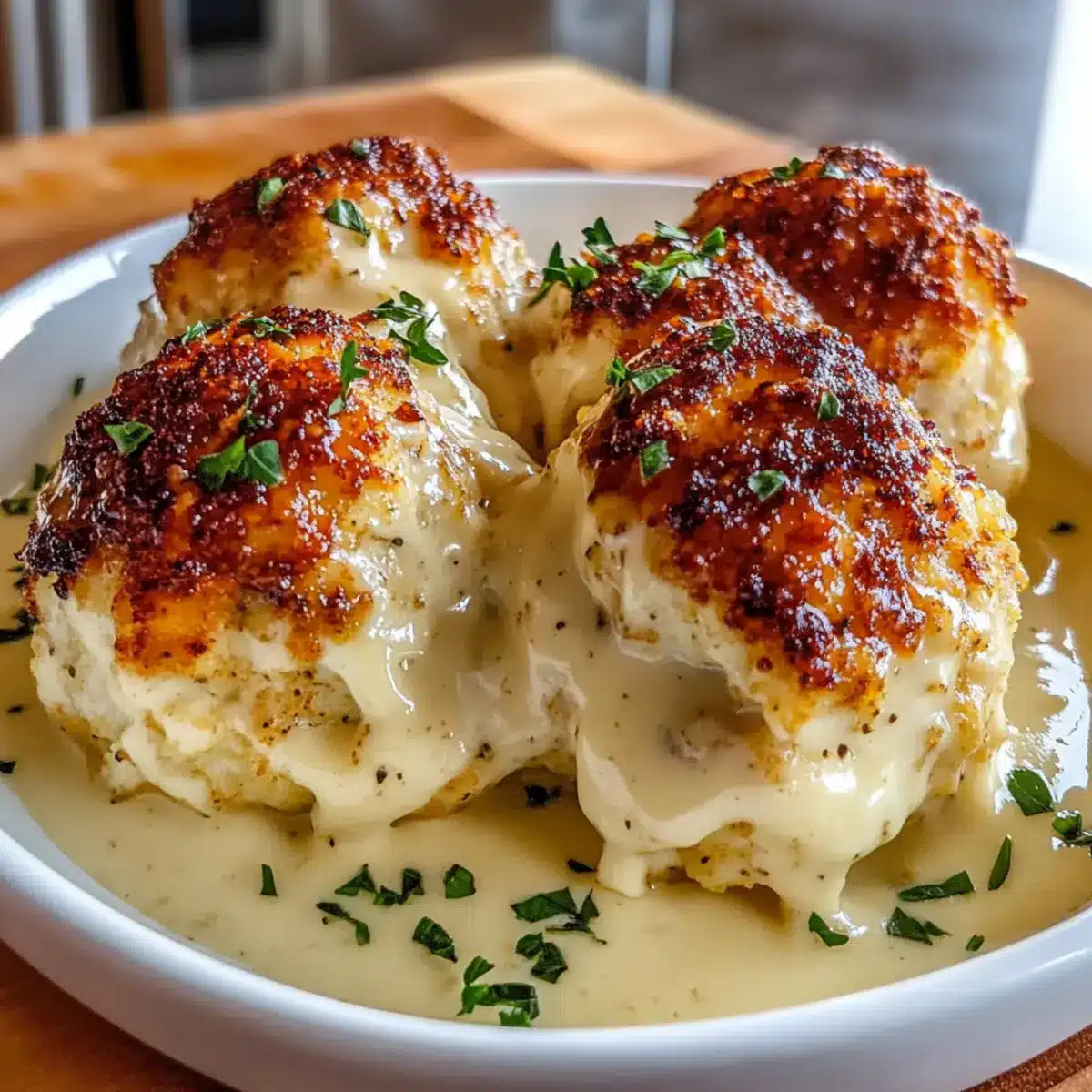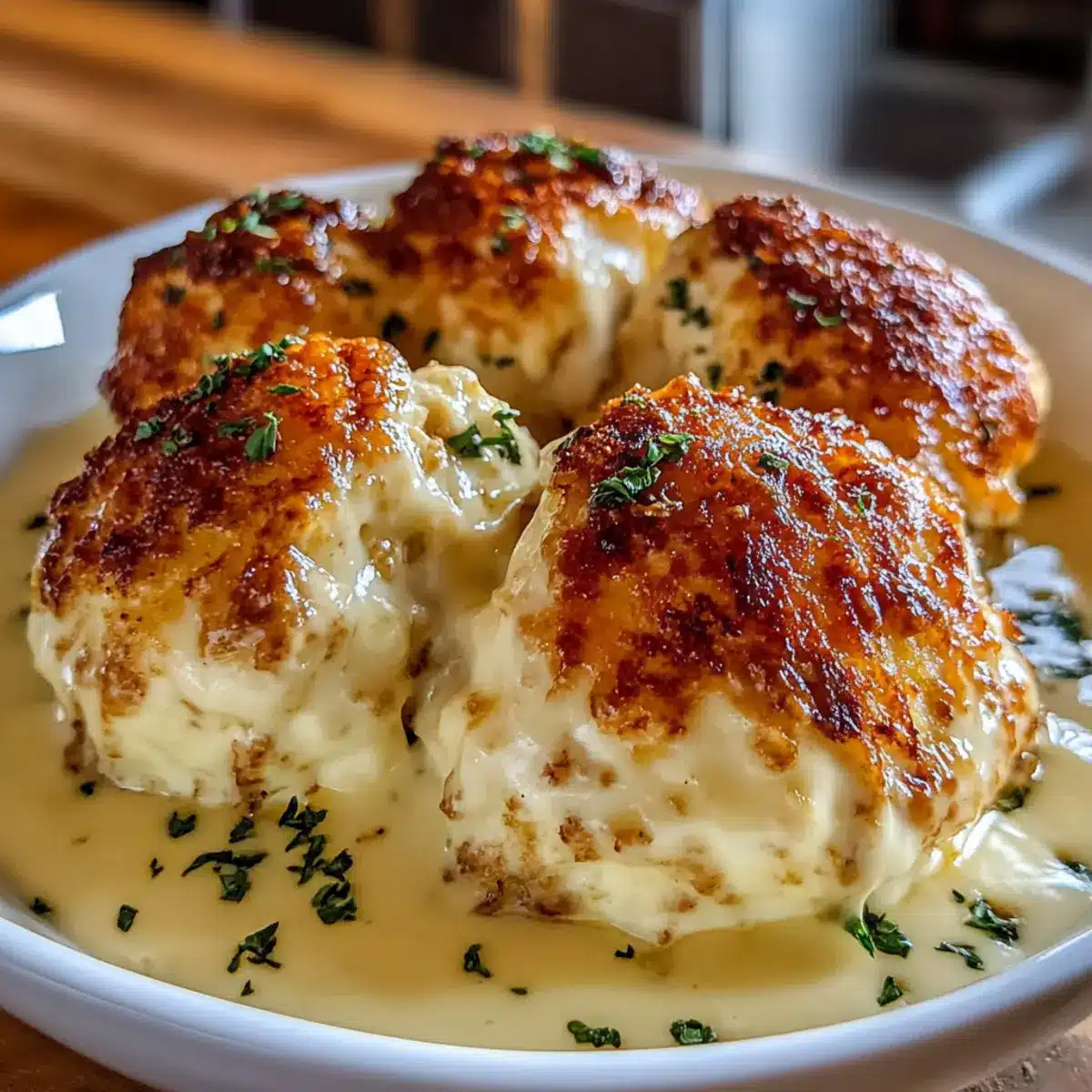 - Transfer baked chicken bombs to a casserole dish, pour creamy sauce over, broil for 3–5 minutes until bubbling and golden.