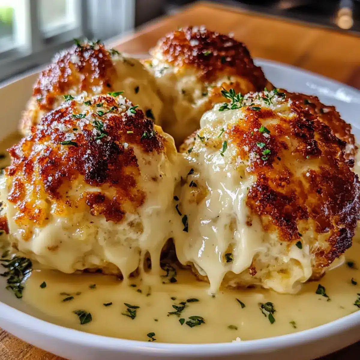 These Parmesan Cloud Chicken Bombs are perfect for meal prep! You can prepare the chicken mixture and form the bombs up to 24 hours ahead. Simply place them on a baking tray, cover with plastic wrap, and refrigerate. For the creamy sauce, whip it up and store in an airtight container in the fridge for up to 3 days. To maintain their quality, cook the chicken bombs straight from the fridge, adding a few extra minutes to the baking time. When ready to serve, simply pour the prepared sauce over the freshly baked bombs and broil for that delicious bubbling finish, ensuring a satisfying meal that tastes just as delightful as when freshly made!