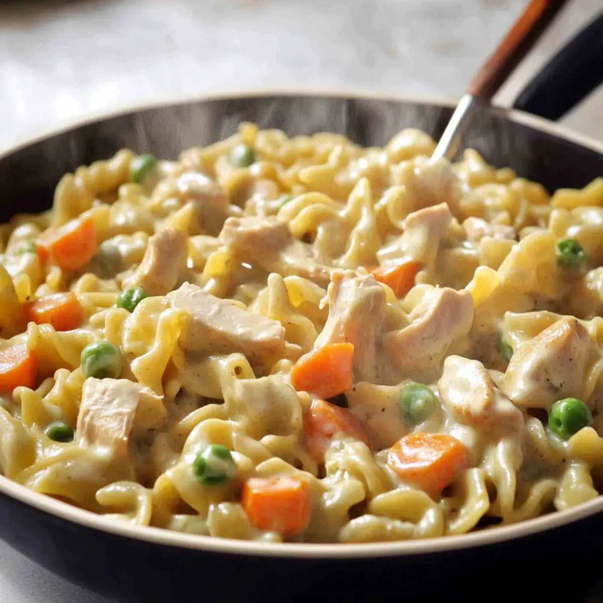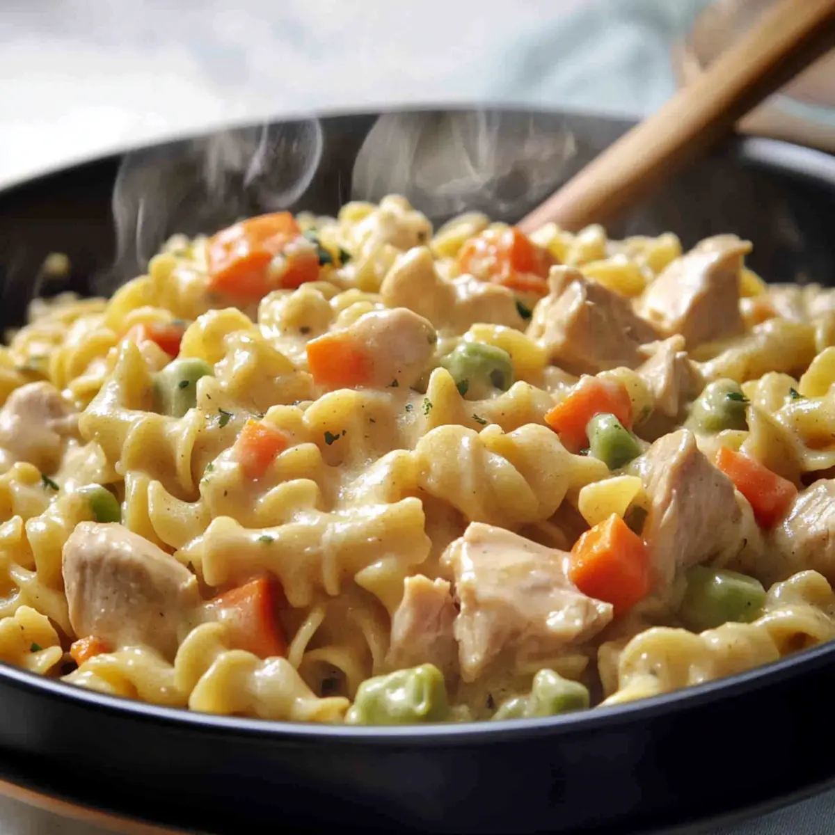 Add the cooked egg noodles to the skillet, gently mixing them into the creamy sauce until everything is well-coated. Allow the mixture to heat through for 1-2 minutes, ensuring your Quick Chicken Pot Pie Pasta is served hot and inviting. Dish it up and enjoy the comforting flavors that bring everyone together at the table!