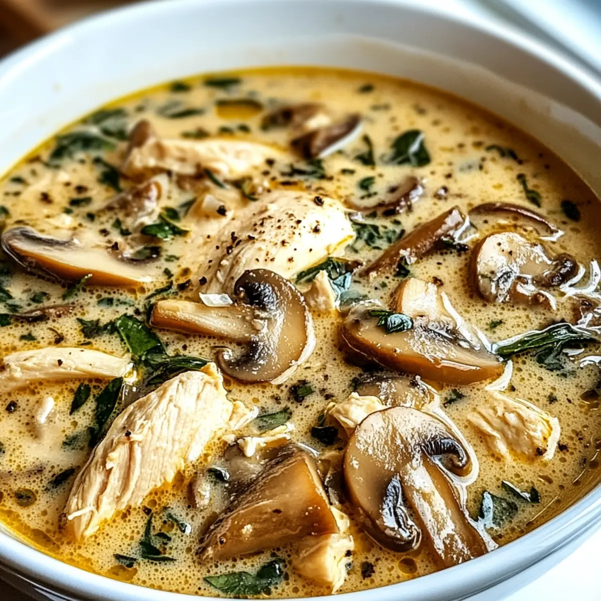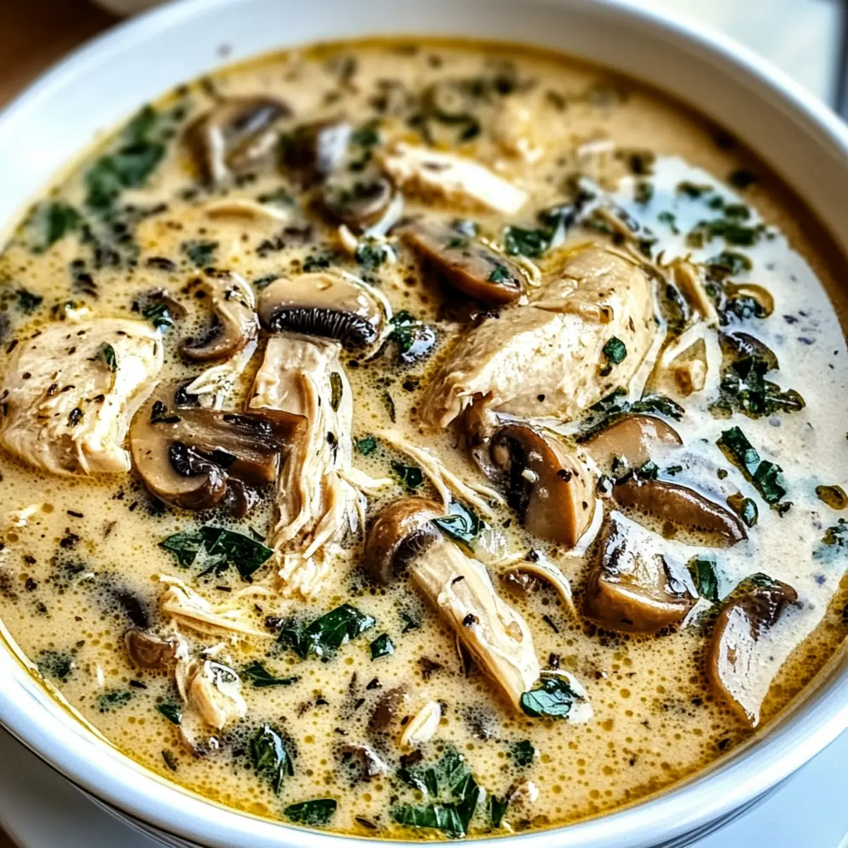 Comforting, hearty goodness: This Rotisserie Chicken Mushroom Soup delivers all the cozy vibes you crave on a chilly evening. Easy preparation: With rotisserie chicken at the core, you’ll spend less time cooking and more time enjoying. Flavor explosion: Earthy mushrooms, fresh garlic, and cream combine for a rich, savory experience. Versatile options: Customize with extra veggies or different herbs to suit your taste. Crowd-pleaser: Perfect for family dinners or surprising guests, this soup will have everyone coming back for seconds! Pair it with crusty bread for the ultimate comfort meal.
