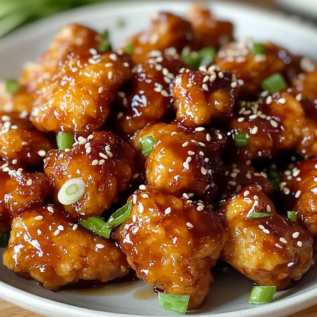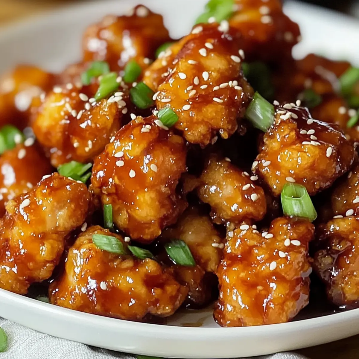 - Toss fried chicken in the sauce until evenly coated. Garnish with sesame seeds and green onions. Serve immediately.