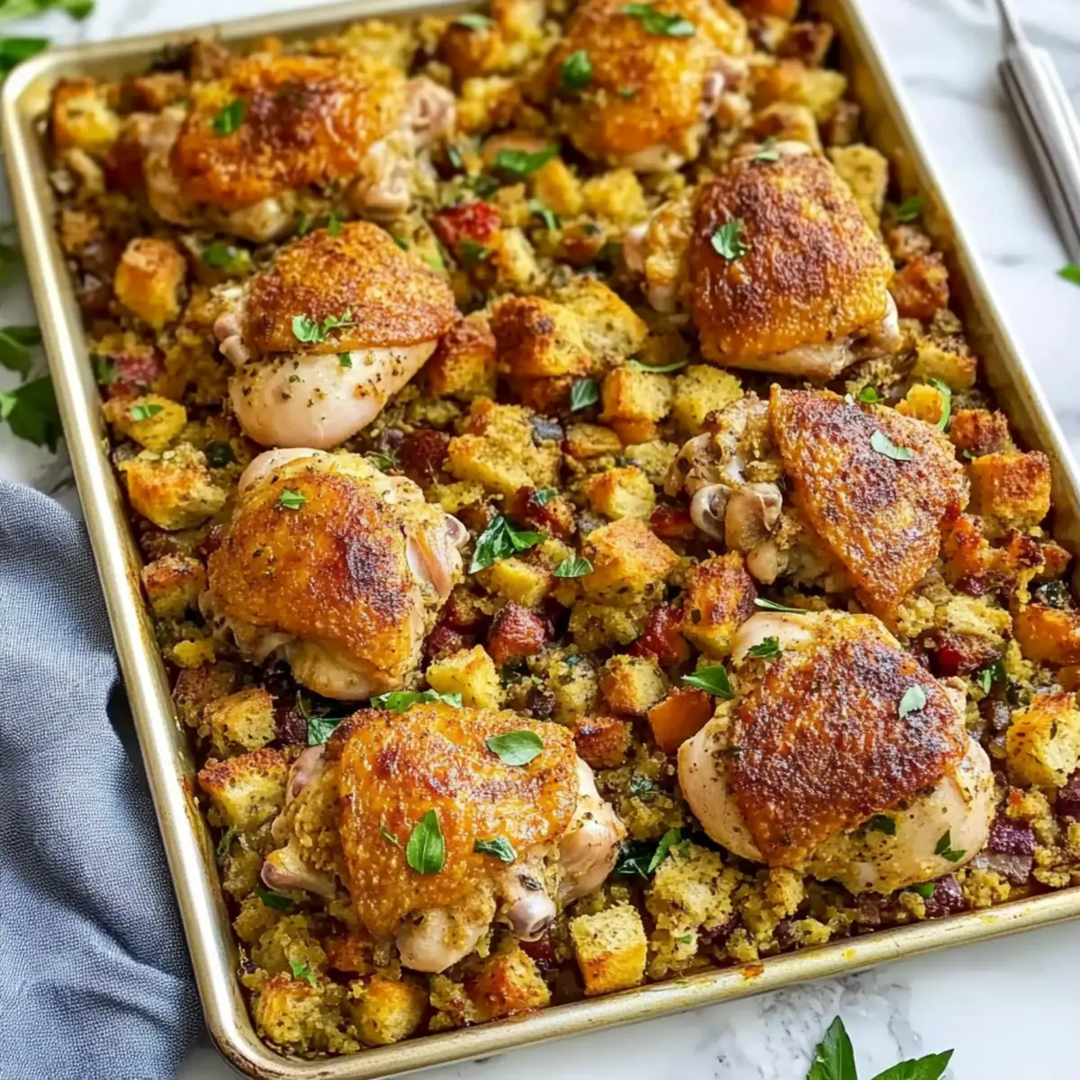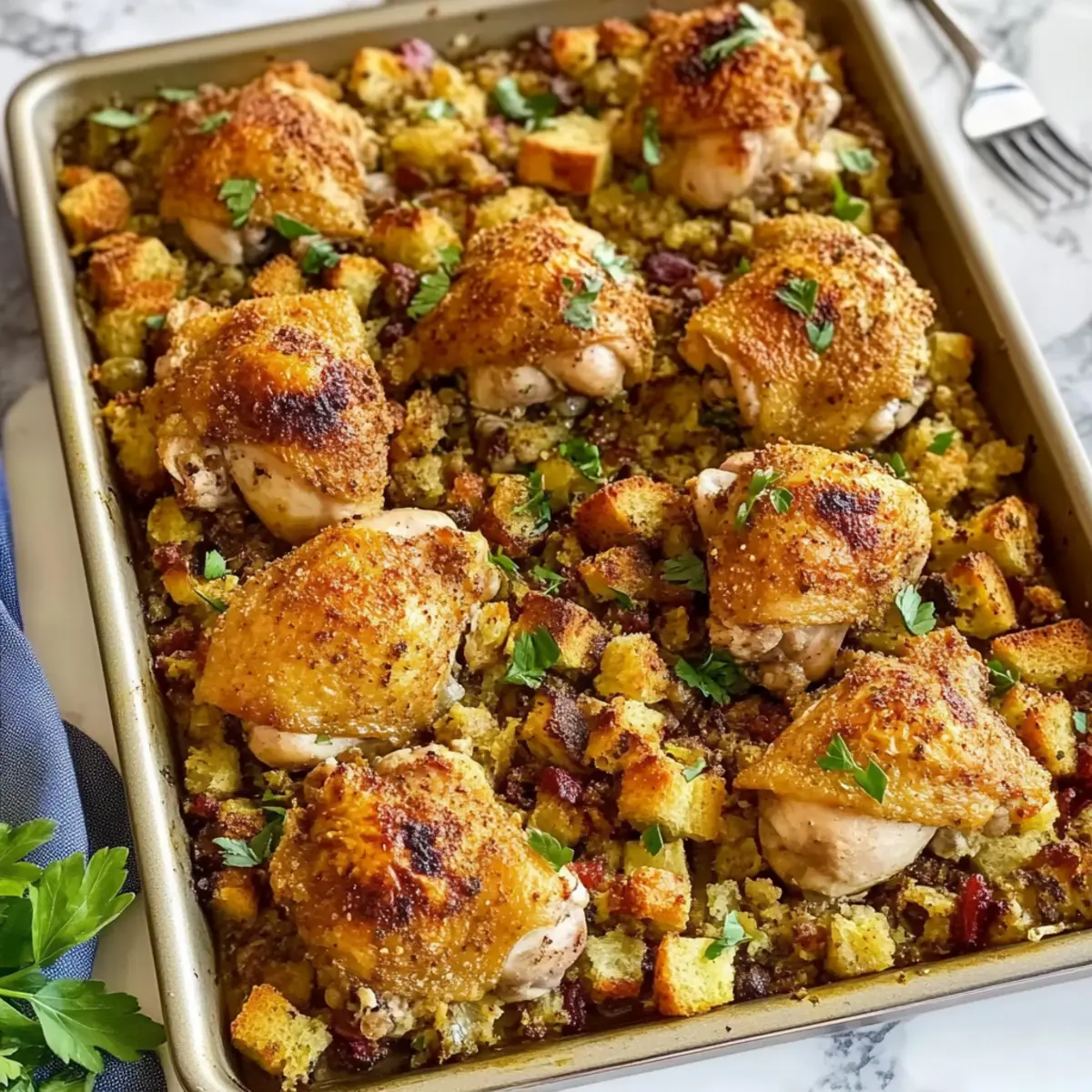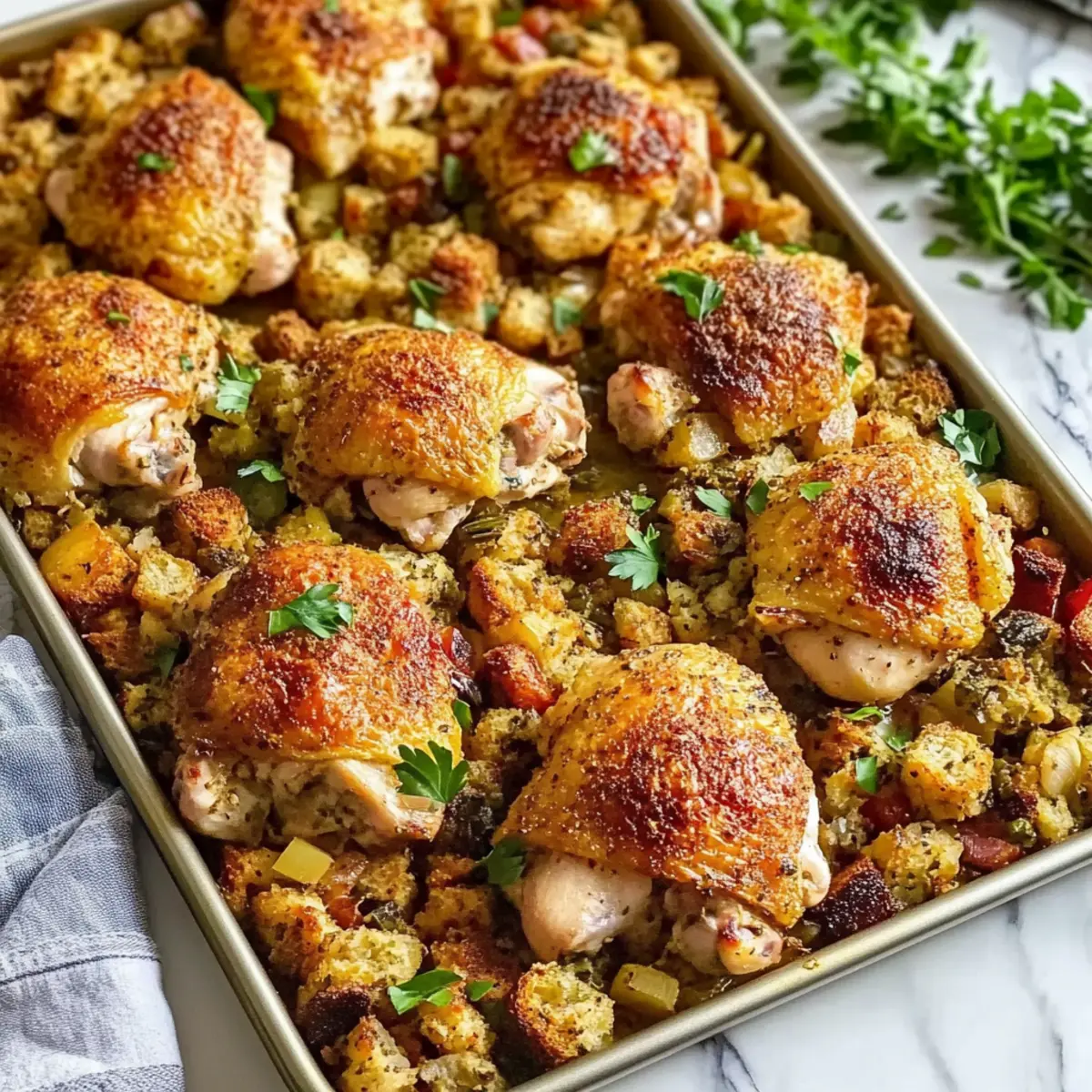 Remove the pan from the oven and let it rest for a few minutes before serving. The succulent chicken thighs paired with savory stuffing create a delightful meal that’s perfect for family dinners or festive gatherings. Serve it warm, accompanied by your favorite cranberry sauce or a crisp green salad for a refreshing contrast.