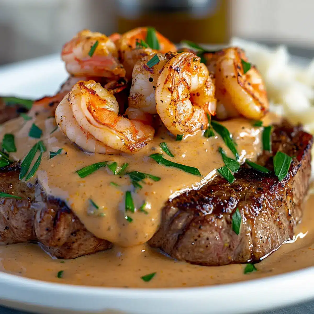 - Slice the rested steak against the grain into thick slices and arrange on a plate. Spoon the creamy Cajun shrimp sauce over the top and garnish with additional parsley, if desired.